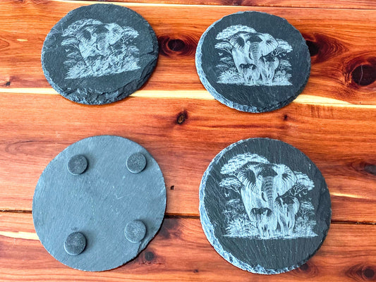 Black Slate Coasters Set - Elephant and Baby Elephants - Anti-Scratch